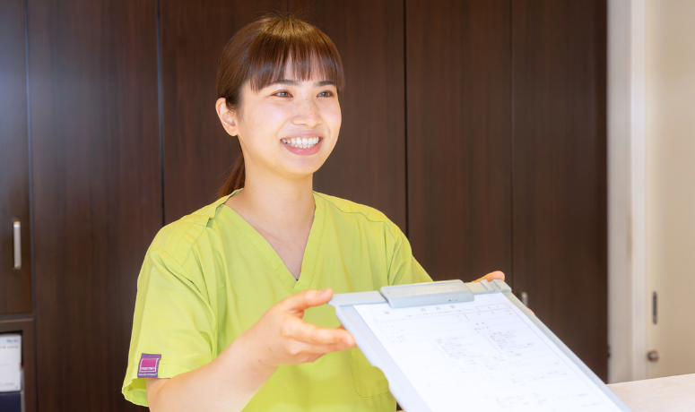 来院された患者様と最初に接する立場なので、笑顔で対応できるよう心がけていますが、スタッフ同士の連携がスムーズなおかげで安心感があります。